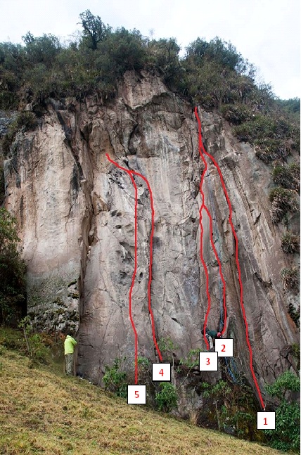 Por el momento hay una vía de IV grado tradicional llamada Vacaanna (:D), excelente para aprender a poner protecciones naturales. La calidad de la roca es muy buena. Está hacia la derecha de las vías de la zona equipada actualmente. El tipo de roca es diferente a la del resto de la zona. La ruta va por bloques grandes que forman escaleras de 2 o 3 metros de alto y que después forman una repisa y así continúa por unos 30 metros hasta llegar a un diedro donde hay 2 spits para rapel y para asegurar. Desde este punto la ruta se pone un poco más dura y no se ha explorado mucho mas arriba.